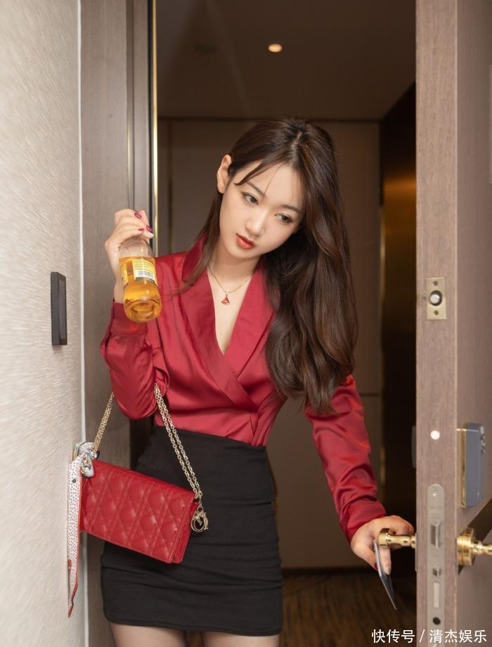 下装的黑包臀短裙更是 “精准发力”。你看那裙摆的宽度,刚好比胯窄一点点,走动时会随着腿的动作贴在大腿内侧,既不会走光,又把腿部的纤细感衬得更明显;短裙的长度卡在大腿中间,刚好露出最直的那段腿型,再配上黑丝的朦胧感,连膝盖的弧度都显得软乎乎的。最绝的是那双酒红色高跟鞋,鞋尖的尖头设计顺着腿型往前延伸,鞋跟的高度刚好让臀部微微上翘,这一套组合拳下来,身段直接从 “好看” 变成 “让人移不开眼”。这整套 look 的妙处,全在 “动静之间的反差” 里。站着的时候,缎面衬衫是服帖的,把肩背腰腹的曲线裹得像一幅工笔画;动起来的时候,衬衫的布料会跟着动作轻轻晃,腰窝的起伏、臀部的弧度都跟着布料的褶皱 “透” 出来,连带着黑丝裹着的腿都显得更软了。你看她靠在门上的样子,一只手搭在门把上,衬衫顺着手臂的动作贴出腰侧的线条,短裙裹着的腿微微弯曲,连指尖捏着手机的弧度都透着劲儿,这哪是摆拍啊,明明是穿搭和身材的 “双向奔赴”。真不是谁都能把 “缎面 + 包臀裙” 穿明白 —— 软缎面会放大身材的缺点,包臀裙会暴露腿型的不足,但唐安琪偏能用这两样把身材衬得 “无死角”:用缎面的贴衬出曲线的柔,用短裙的挺衬出线条的利,再用同色系鞋子把整体串起来,既突出了女性的身材美,又没丢了高级感。这才是真穿搭高手,把 “性感” 穿成了 “让人忍不住欣赏” 得体面。